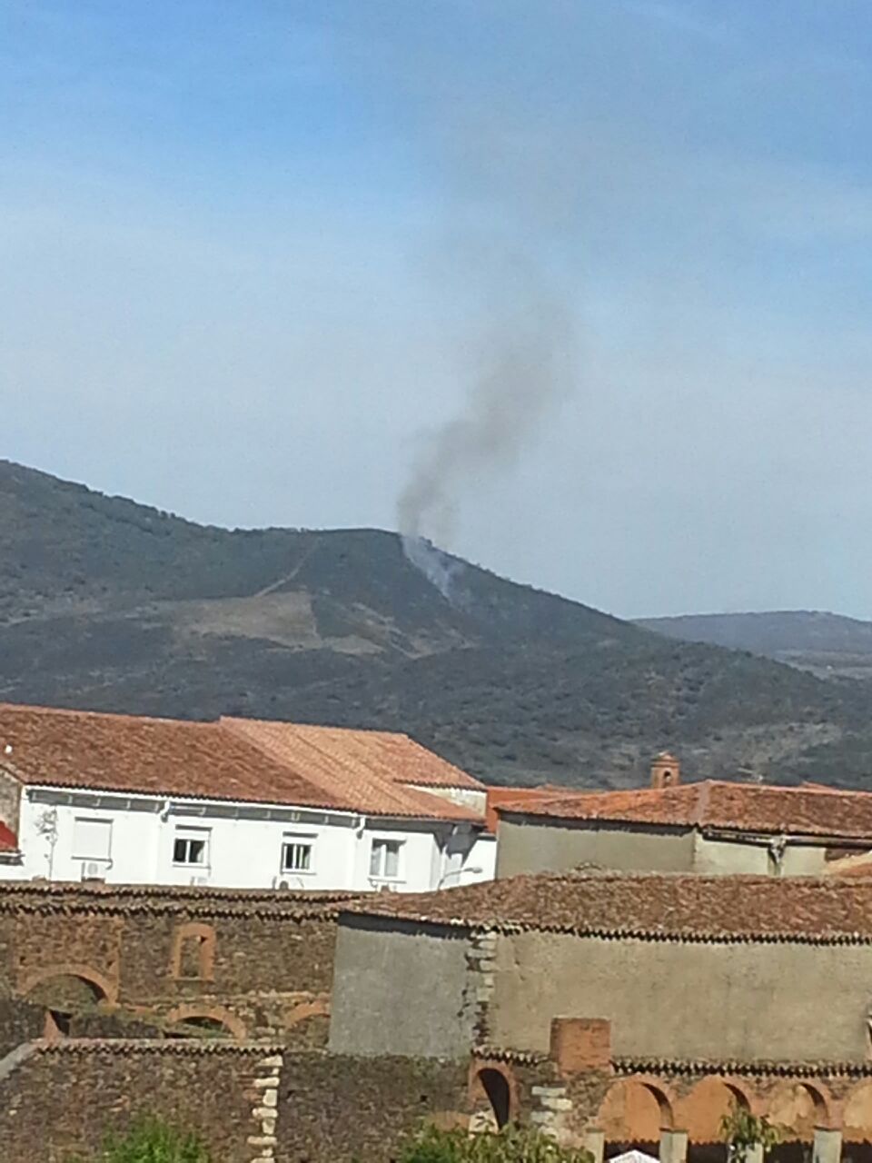 El incendio, que se ha iniciado alrededor de las 11 de la mañana, ya se encuentra controlado, pero al parecer ha alcanzado la cima de la citada sierra y ha afectado a ambos lados de algunos tramos de la carretera de Berzocana. (fotos J.A. Gil, Ayuntamiento de Logrosán y María Romero)