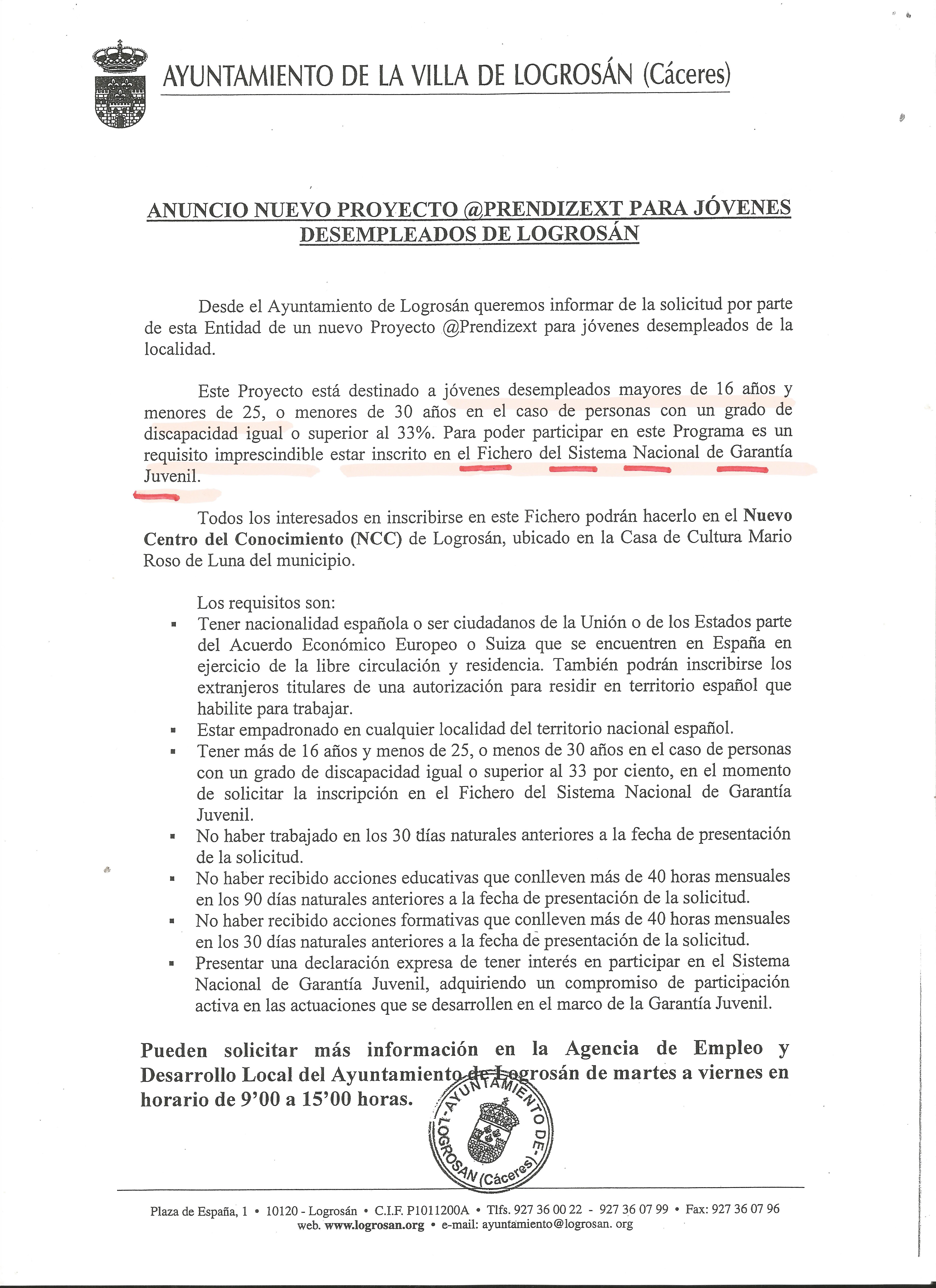 Desde el NCC se ofrece plena colaboración para la gestión del alta e inscripción en el Fichero del Sistema Nacional de Garantía Juvenil, podéis informaros en teléfono 927360815 para pedir cita o directamente en el NCC Casa de Cultura Avda. Hernandez Serrano, s/n. Os esperamos.