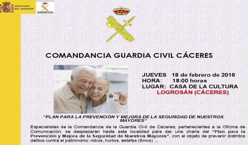 El Ayuntamiento, en colaboración con la Comandancia de la Guardia Civil de Cáceres, organiza una Charla de prevención y mejora de la seguridad de nuestros mayores. La charla será impartida por expertos en el tema de la benemérita y tendrá lugar el jueves 18 de febrero a las 6 de la tarde en la casa de la cultura.