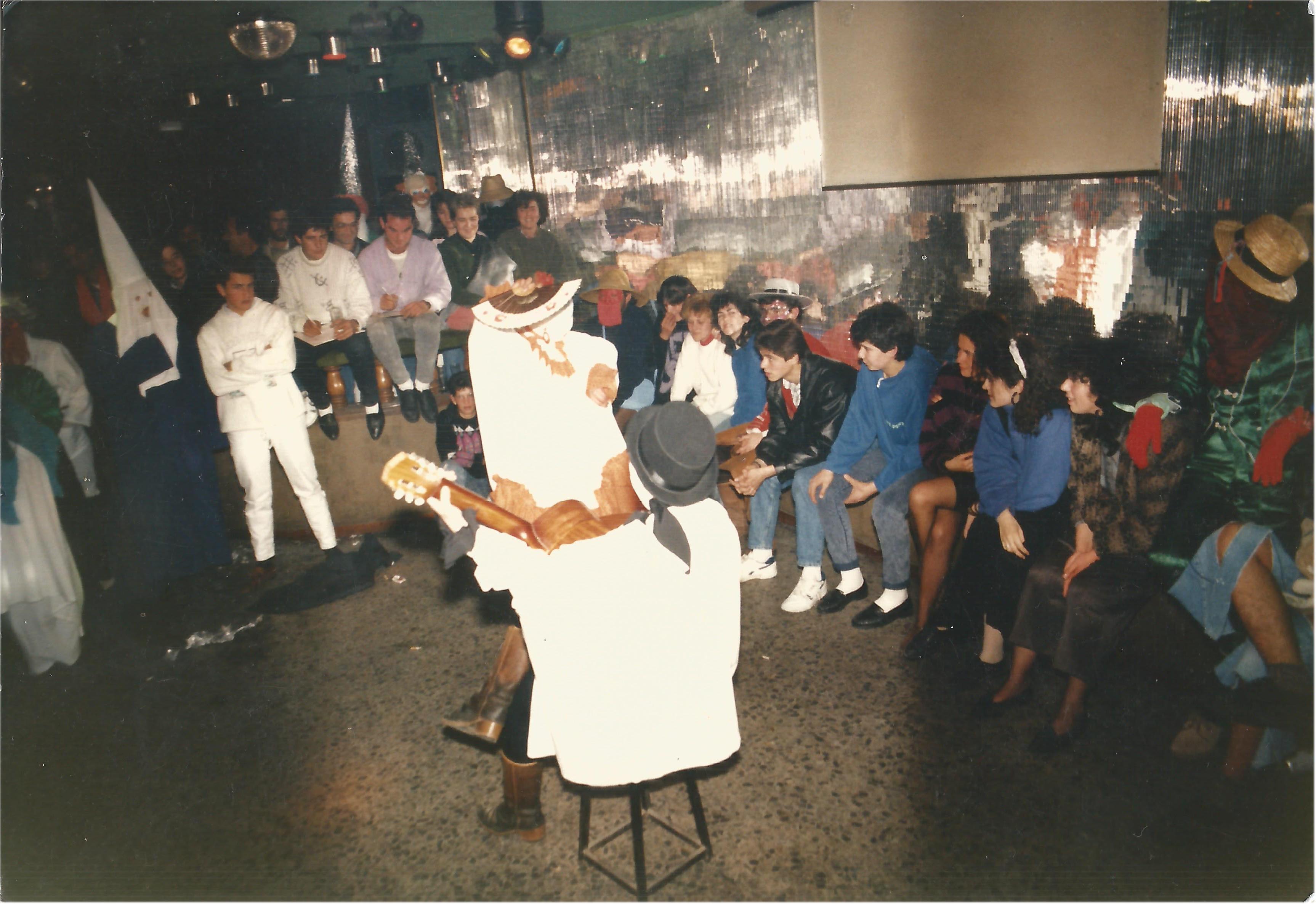 Al lado, se encontraba un reducido cubículo donde se pinchaba la música, con una ventana, desde la que se veía toda la pista, dos platos mezcladores para microsurcos, una mesa de conmutadores, para manejar las luces, sobre la mesa, unas estantería, llenas de discos, que llegaban hasta el techo. Una pequeña habitación, con una cama, el crucifijo preceptivo, en la pared, sobre la cabecera. Allí dormía la madre de Tomás, persona muy conocida y respetada. Hasta que no se acababa la “sesión disco”, no podía ocupar su habitación. Sobre la cama se apilaban todos los abrigos, en invierno. En las grandes ocasiones, ni se cabía, literalmente, a veces llegaba uno a soñar con pinchar discos, para “escapar”, de alguna forma, a los apretones. El balcón que da a la carretera, más lleno imposible, de gente joven. ¿Cuántos vasos no se habrán estrellado contra el asfalto, al ser tirados, malintencionadamente, desde ese balcón?.