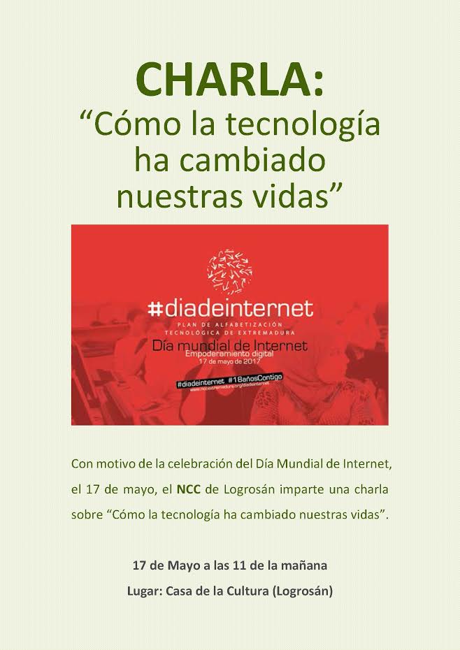 «Cómo la tecnología ha cambiado nuestras vida» es el título de la charla-coloquio que los responsables del Nuevo Centro del Conocimiento (NCC) de Logrosán ha organizado para este miércoles, Día Mundial de Internet, en la Casa de la Cultura este miércoles a las 11 de la mañana.