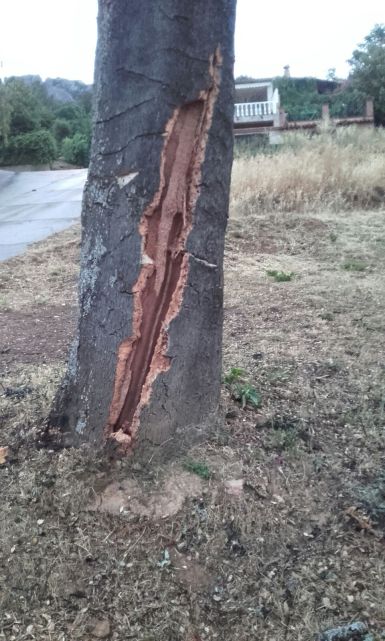 Tras fuertes tormentas por la zona de las Villuercas, en Cañamero ha caído un rayo en el Barrio del Coto alcanzando un alcornoque centenario a apenas 5 metros de una vivienda.