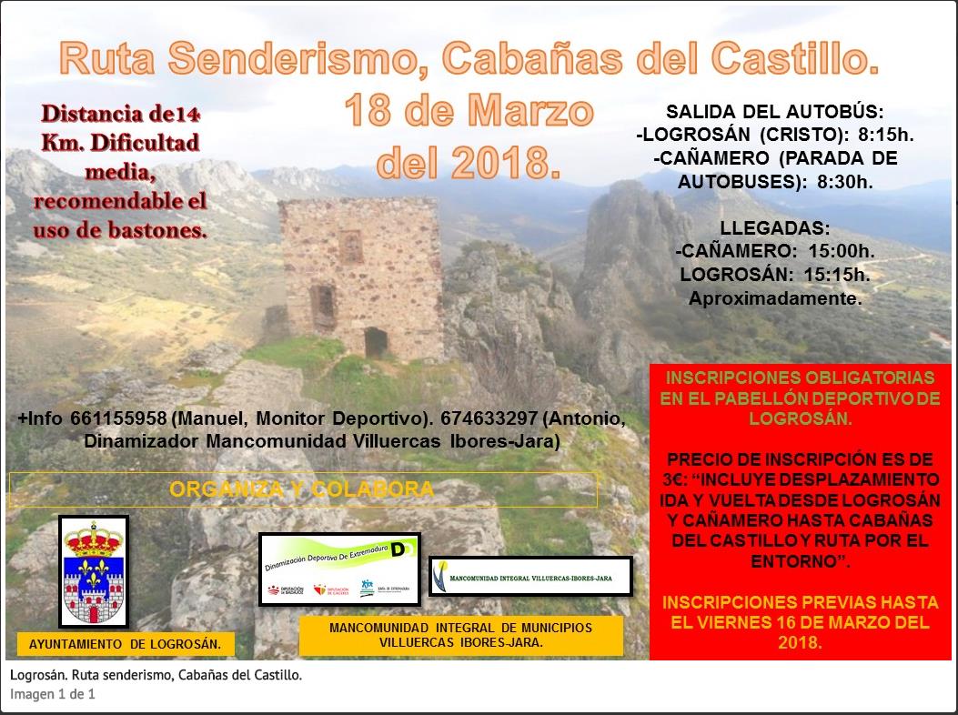 SENDERISMO. Por otra parte, el Ayuntamiento logrosano y la Mancomunidad han organizado una ruta senderista en Cabañas del Castillo para el 18 de Marzo. La ruta partirá en bus desde Logrosán y tendrá parada en Cañamero para los cañameranos que se quieran sumar a esta actividad.