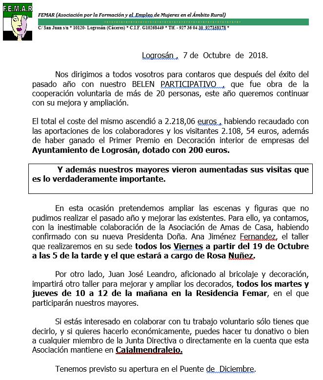 La asociación FEMAR ha publicado una carta en la invitan a los logrosanos a que participen en esta actividad altruista y solidaria que tanto ilusiona los mayores residente y anuncia la puesta en marcha de talleres previos de manualidades para la creación y decoración de figuras y escenarios.