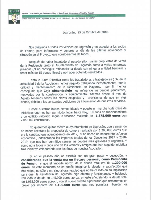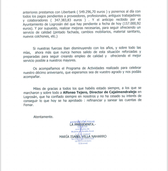 “… En este momento no os podéis imaginar la alegría y satisfacción que nos rodea, no sólo a mi, sino al gran equipo que no ha cesado en su implicación para que la Residencia de Logrosán, siga abierta y funcionando, y habiendo reducida la deuda en 145.000 euros aproximadamente en este año, siendo la deuda total de 1.055.000 euros con el nuevo crédito hipotecario que firmaremos en breve por importe de 1.100.000 euros que nos permitirá liquidar los anteriores prestamos con Liberbank ( 549.296,70 euros ) y ponemos al día con todos los pagos pendientes a proveedores, profesionales, antiguos trabajadores y colaboradores ( 347.383,83 euros ) . Y el anticipo recibido por el Ayuntamiento de Logrosán del que hay pendiente a fecha de hoy (157.000,92 euros).” Afirma el comunicado de Isabel Villa.