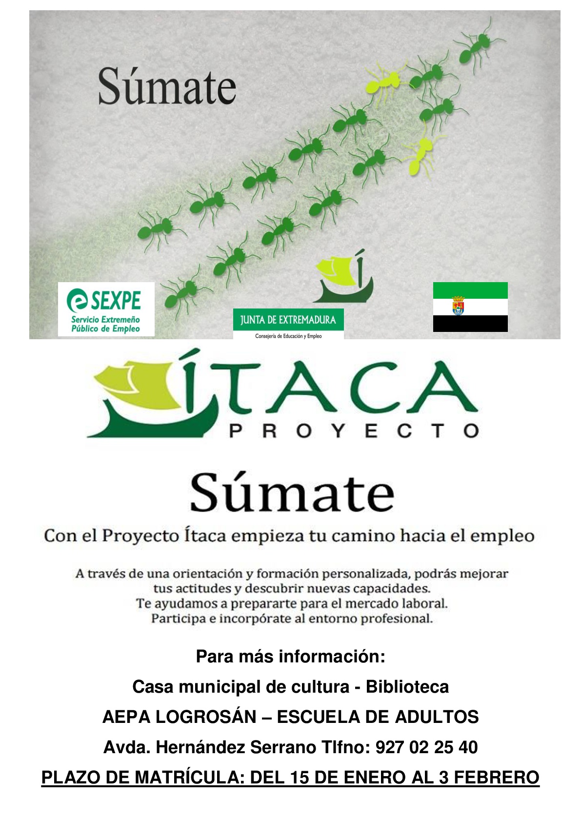 Desde el 21 de enero y hasta el 4 de febrero está abierto el plazo para aquellas personas mayores de 18 años, que no poseen título de la ESO, para presentar las solicitudes de admisión al curso de Competencias Clave dentro del Proyecto Ítaca. Este curso es requisito imprescindible para obtener los certificados de profesionalidad de Nivel II que oferta el SEXPE. No obstante, y con carácter excepcional, podrán matricularse los mayores de 16 años y menores de 18 que lo soliciten, siempre que tengan un contrato laboral que no les permita acudir a las clases de un Instituto con normalidad.