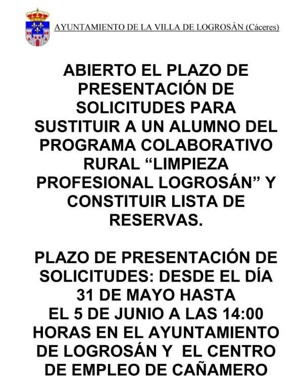 esde el Ayuntamiento de Logrosán se ha abierto un nuevo plazo de solicitud de participación en el Programa Colaborativo Rural «Limpieza Profesional Logrosán», para la sustitución de un alumno-trabajador y la constitución de lista de reservas.El plazo para presentar las solicitudes (tanto en el Ayuntamiento de Logrosán, como en el centro de empleo de Cañamero) finaliza el día 5 de junio a las 14:00 horas.