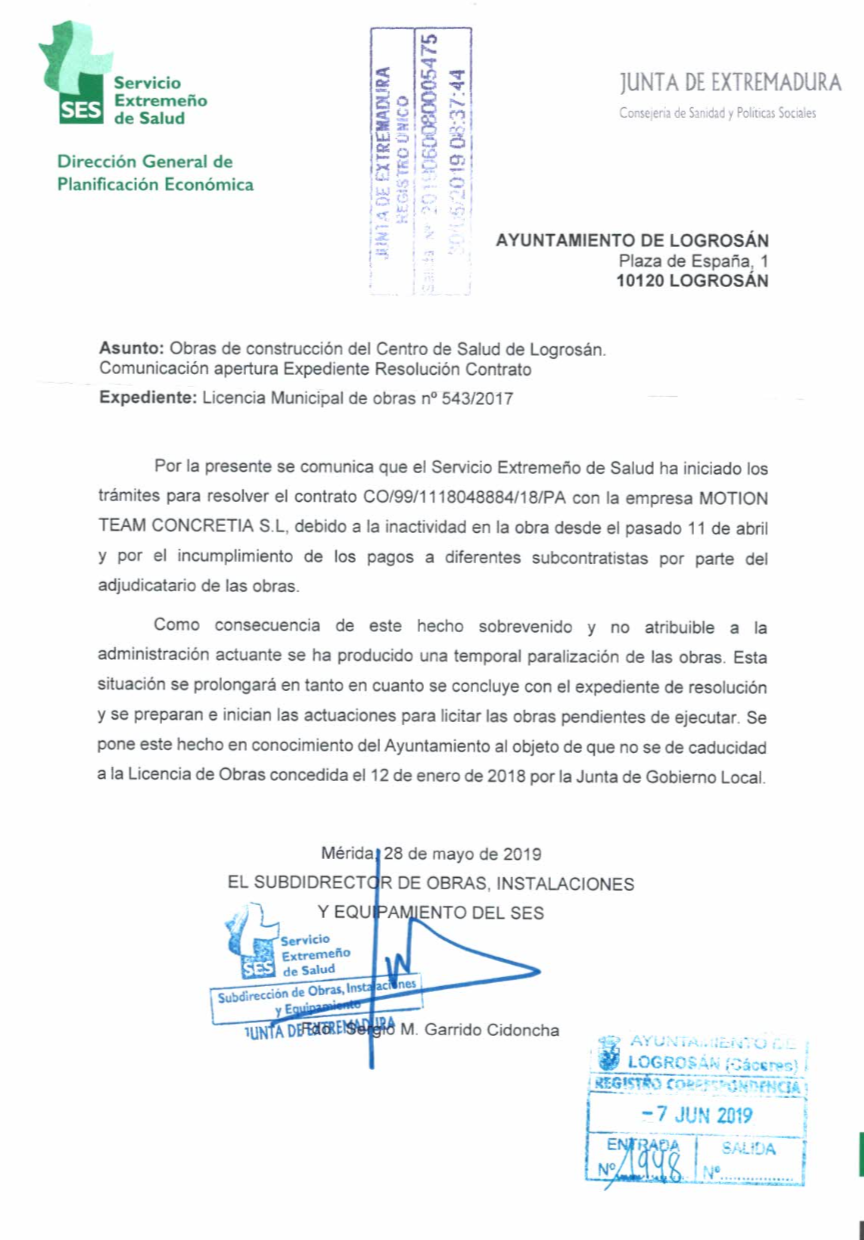 El Ayuntamiento de Logrosán ha recibido un comunicado del SES (Servicio Extremeño de Salud) en el que advierte al consistorio de la inactividad prolongada de la empresa e insta a la administración local a que busque una solución antes de que caduque la licencia de la obra.