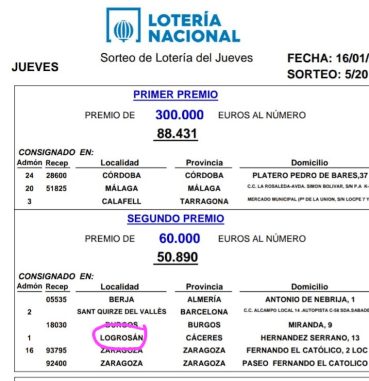 El sorteo de la Lotería Nacional de este jueves, 16 de enero, ha dejado caer el segundo premio en Logrosán.