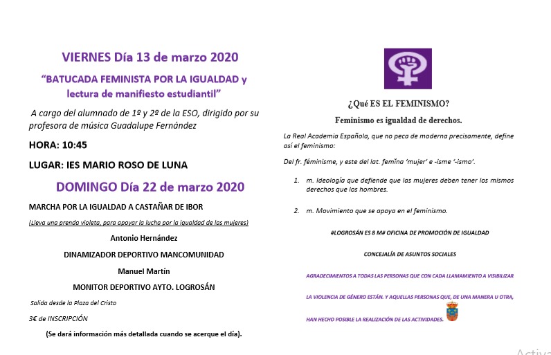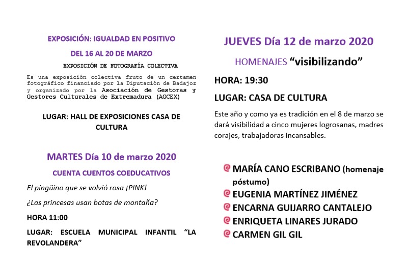 Durante esta semana, los días previos y posteriores al 8 habrá otros actos organizados por el Ayuntamiento como una «batucada», lecturas de manifiestos, cuentacuentos, exposiciones de fotografía y una marcha colectiva por la igualdad el día 22 a Castañar de Ibor.
