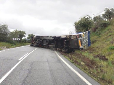 Tras el vuelco ha quedado atravesado en medio de la vía cortando en tráfico en ambos sentidos a la altura del Pozo Calles, en la cuesta de la variante, poco antes de la rotonda de El Palomar.