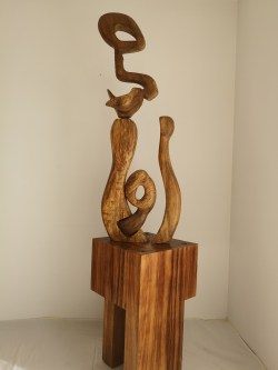 TOTEMUJER – DIGNIDAD en madera brasileña de Mandioqueira, está formada por cuatro piezas con la posibilidad de intercambiar su posición en la base (madera africana de Kambala) dando posibilidad para crear diversas visiones de la misma escultura.